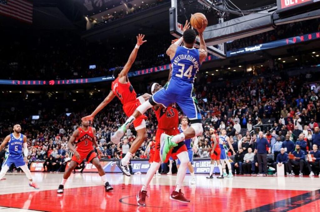 | Giannis Antetokounmpo tente un tir derrière le panneau dans les derniers instants de la deuxième mi-temps du match NBA contre les Toronto Raptors. |