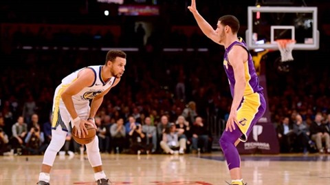 | Le meneur des Golden State Warriors Stephen Curry (gauche) face à Lonzo Ball des Los Angeles Lakers au Staples Center. |