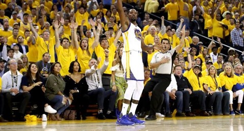 Cinq ans après sa seule finale NBA, qu'il avait terminée en larmes sous le maillot d'Oklahoma City, défait par Miami (4-1), Durant n'a pas manqué son rendez-vous et a donné le ton d'entrée avec pas moins de six spectaculaires "slam dunks".