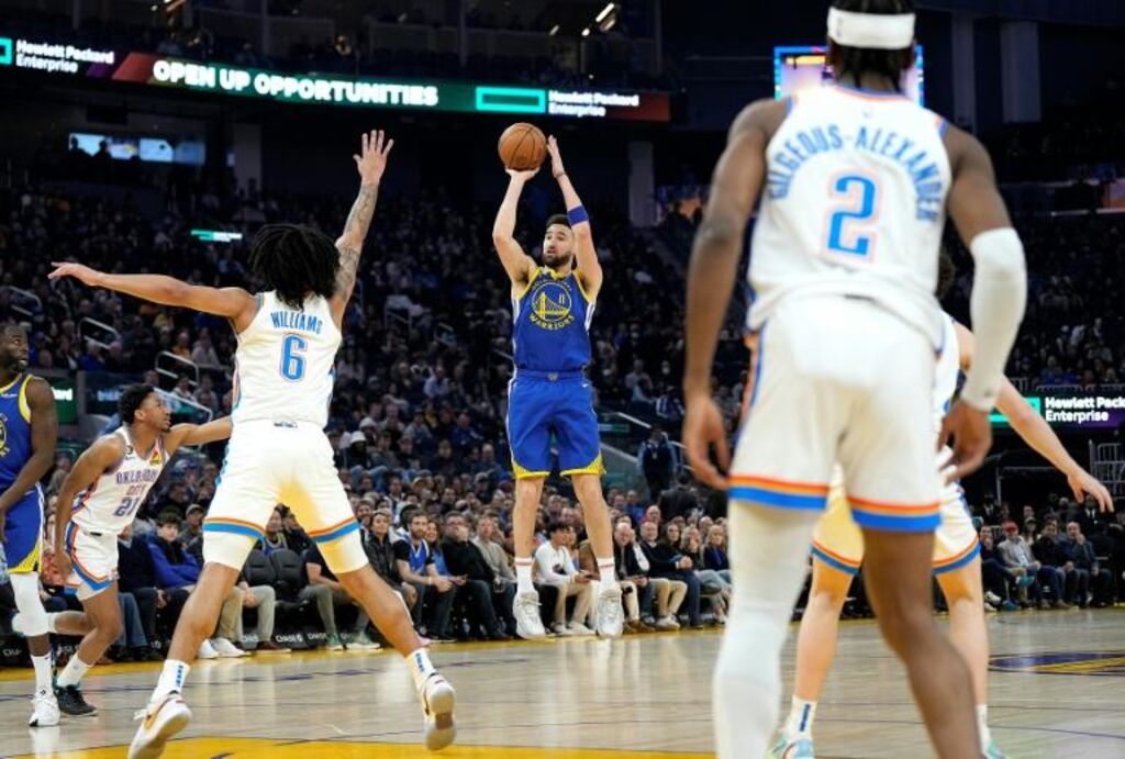 | Klay Thompson, des Golden State Warriors, tente un tir à trois points lors d'un match de NBA contre le Thunder d'Oklahoma, le 6 février 2023 à San Francisco. |