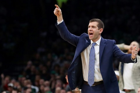 | L'entraîneur des Boston Celtics, Brad Stevens, donne des instructions lors du match NBA contre les Dallas Mavericks, le 4 janvier à Boston. |
