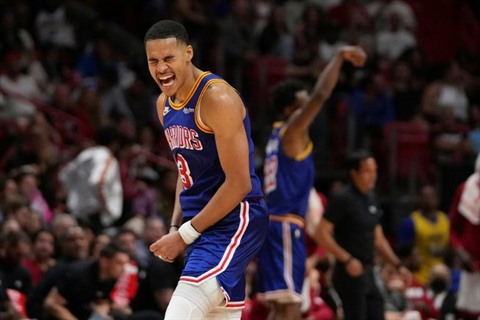 | Jordan Poole, meilleur marqueur de la rencontre avec 30 points, a propulsé ses Golden State Warriors vers un succès à Miami, le 23 mars. |