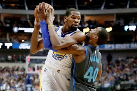 | Kevin Durant (gauche) des Golden State Warriors à la lutte avec Harrison Barnes des Dallas Mavericks en NBA à Dallas. |