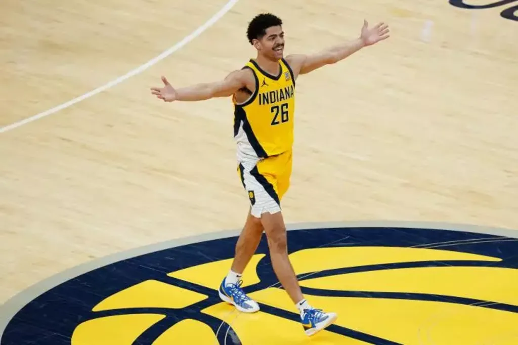 | Ben Sheppard, des Indiana Pacers, lors du match 6 de la finale NBA contre l'Oklahoma City Thunder, le 19 juin à Indianapolis. |