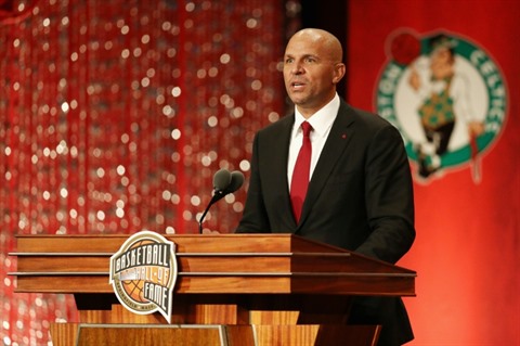 | L'Américain Jason Kidd fait une allocution après son intronisation au Hall of Fame du basket basé à Springfield (Massachusetts) où ce sport a été inventé, le 7 septembre. |
