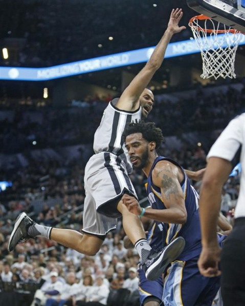 | Tony Parker (gauche) des San Antonio Spurs contré par Mike Conley des Memphis Grizzlies, le 15 avril 2017 à San Antonio, au Texas. |