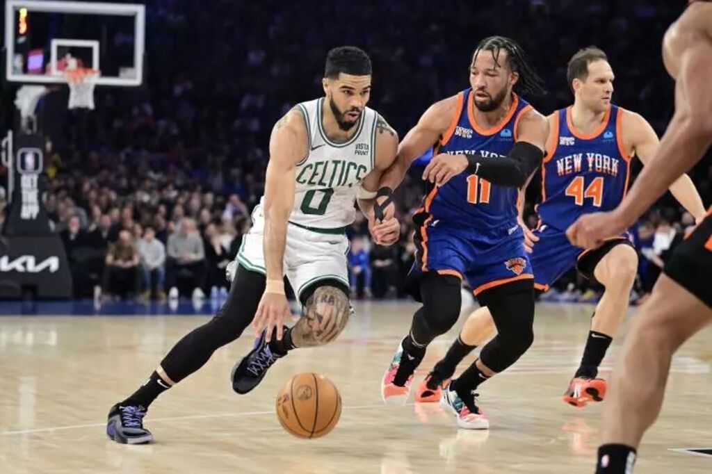 | Jayson Tatum (#0), des Boston Celtics face à Jalen Brunson (#11), des New York Knicks, lors d'un match de saison régulière de NBA, le 24 février à New York. |