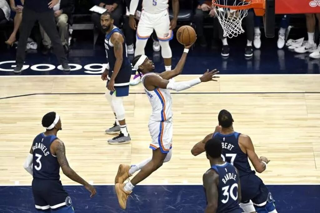 | Shai Gilgeous-Alexander (centre) lors du match 4 de la finale de conférence Ouest de NBA entre Oklahoma City et Minnesota, le 26 mai à Minnesota. |