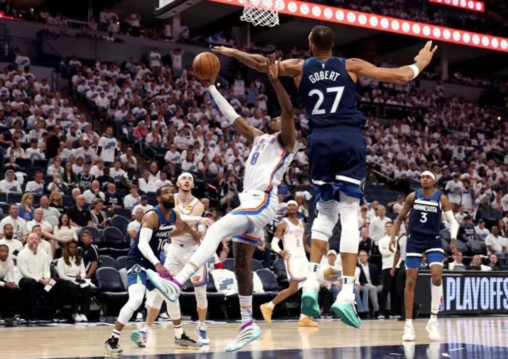 | Rudy Gobert défend sur Jalen Williams lors du match 4 de la finale de conférence Ouest de NBA entre Minnesota et Oklahoma City, le 26 mai à Minneapolis. |