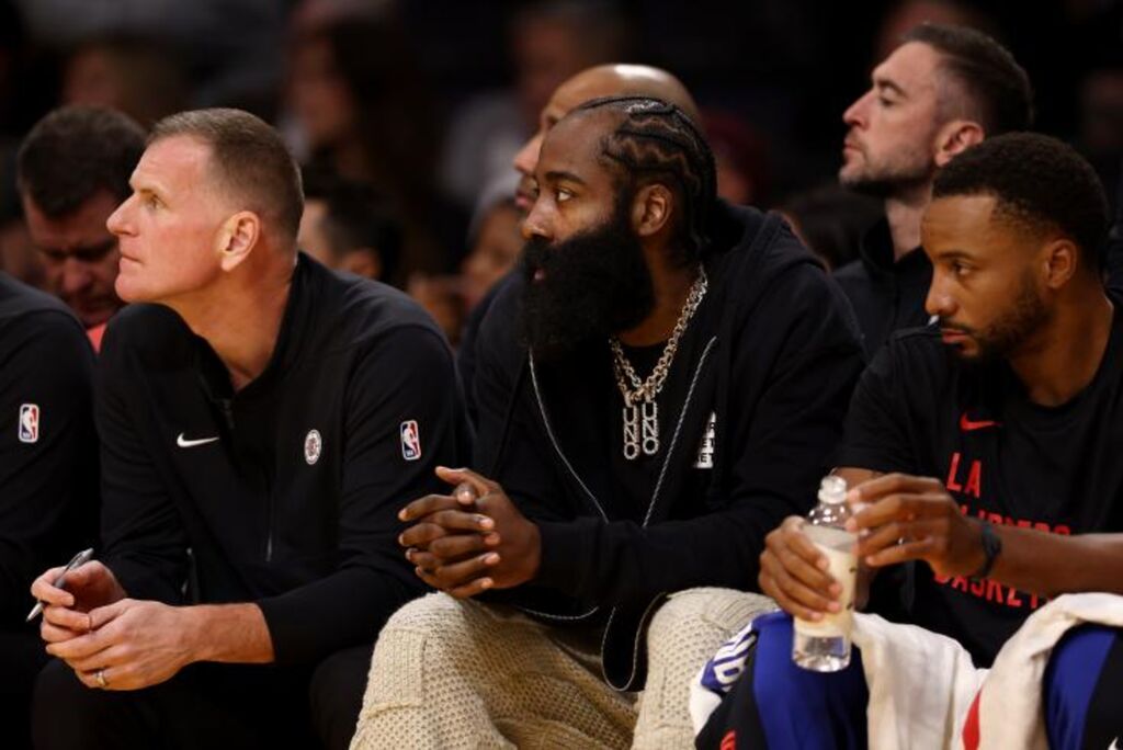 | James Harden assiste au match entre les Lakers et les Clippers, sa nouvelle équipe, le 1er novembre à Los Angeles. |