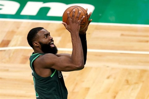 | Le N.7 des Celtics Jaylen Brown s'apprête à tirer lors d'un match de NBA contre Dallas, le 31 mars à Boston dans le Massachusetts. |