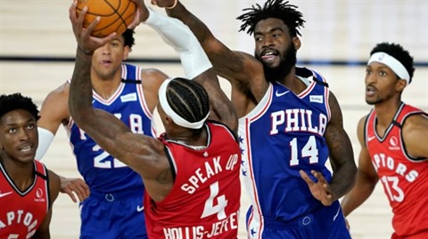 | Duel entre Norvel Pelle et Rondae Hollis-Jefferson durant le match Philadelphie - Toronto le 12 août à Orlando. |