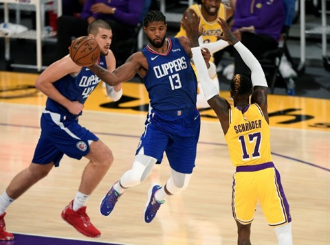| Paul George des LA Clippers, ballon en main, lors de la victoire chez les Los Angeles Lakers en ouverture de la saison NBA, le 22 décembre. |