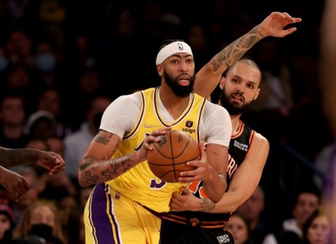 | Anthony Davis, des Los Angeles Lakers, essaie de faire une passe, empêché par Evan Fournier, des New York Knicks, lors du match entre les deux franchises, le 23 novembre au Madison Square Garden de New York. |