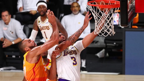 | Le joueur des Lakers Anthony Davis (N°3 en blanc) face à celui du Jazz, Rudy Gobert, en match NBA le 3 août à Lake Buena Vista, Floride. |