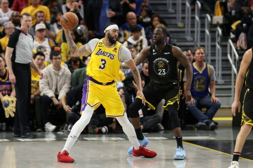 | Le joueur Anthony Davis (3) des Los Angeles Lakers face à Draymond Green (23) des Golden State Warriors durant le demi-finale de playoffs de la conférence Ouest le 2 mai au Chase Center de San Francisco, Californie. |