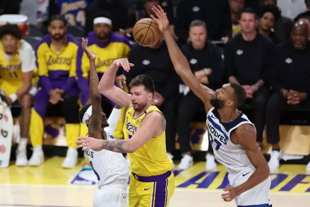 | La star slovène des Lakers Luka Doncic (centre) face à Jaden McDaniels (gauche) et Rudy Gobert, des Minnesota Timberwolves, lors du match 2 de leur série, en play-offs de NBA, le 22 avril à Los Angeles. |