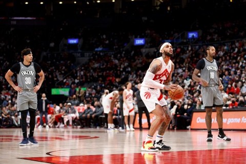 | Gary Trent, des Toronto Raptors, au lancer-franc contre les Brooklyn Nets en NBA le 1er mars à Toronto. |