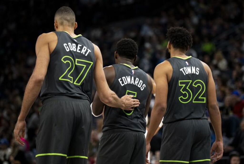 | Les trois stars des Minnesota Timberwolves Rudy Gobert (#27), Anthony Edwards (#5) et Karl-Anthony Towns (#32), lors d'un match de NBA contre les San Antonio Spurs, le 6 décembre à Minneapolis. |