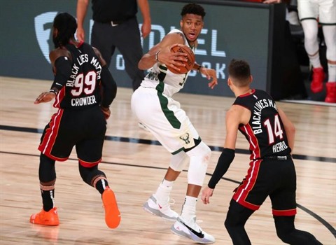 | Le joueur-vedette des Milwaukee Bucks Giannis Antetokounmpo lors de la victoire de son équipe face à Miami le 6 août à Orlando. |