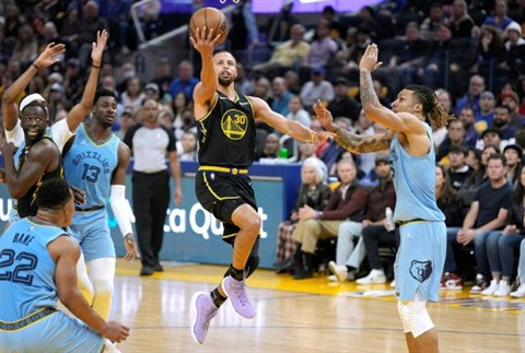 | Stephen Curry (centre) lors de la victoire des Warriors face aux Memphis Grizzlies, le 7 mai à San Francisco. |