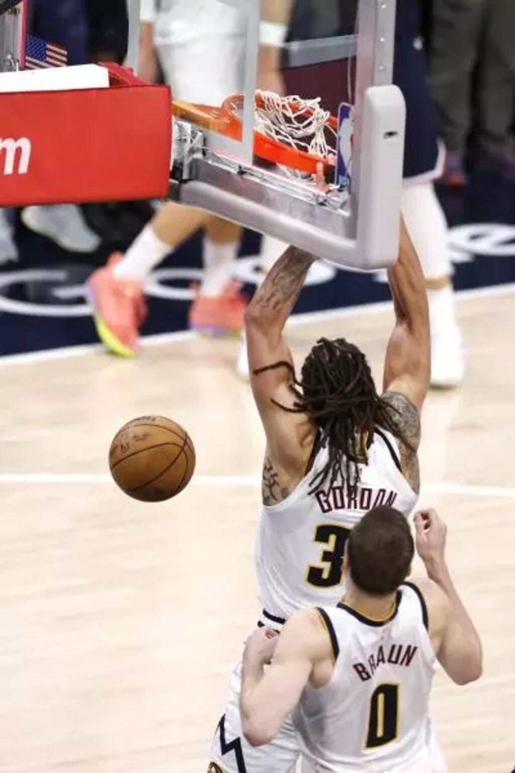 | Le dunk "au buzzer" d'Aaron Gordon, qui donne la victoire aux Denver Nuggets au match de la série des play-offs contre les Clippers, le 26 avril à Los Angeles. |