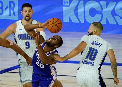 | Les cadres du Magic Evan Fournier et Nikola Vucevic bloquent l'accès au cercle à Alec Burks (Philadelphie) dans la bulle de Disney à Orlando, le 7 août 2020. |