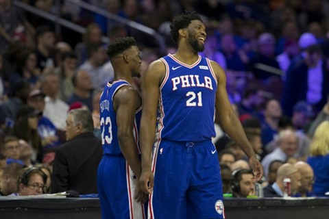 | Jimmy Butler (gauche) et Joel Embiid, joueurs des Philadelphia 76ers, face aux Brooklyn Nets en play-offs NBA, mardi 23 avril à Philadelphie. |