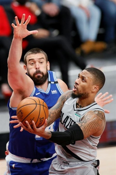 | Marc Gasol, des Los Angeles Lakers, défend sur Damian Lillard, des Portland Trail Blazers, lors du match entre les deux franchises, le 7 mai 2021 à Portland. |