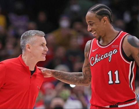| L'entraîneur des Bulls, Billy Donovan (gauche), discute avec son joueur DeMar DeRozan dans les dernières secondes d'un match entre les Chicago Bulls et les Los Angeles Lakers, au United Center de Chicago (Illinois), le 19 décembre. |