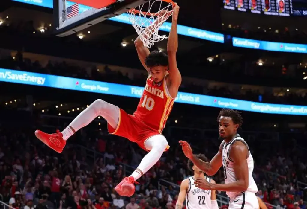 | Zaccharie Risacher (Atlanta Hawks) au dunk contre les Brooklyn Nets en NBA au State Farm Arena le 23 octobre 2024 à Atlanta, Géorgie. |