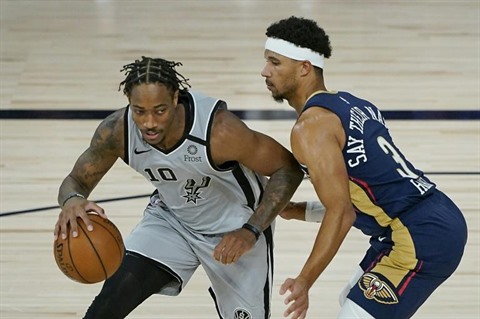 | DeMar DeRozan des San Antonio Spurs lors du match de NBA contre les New Orleans Pelicans, à Lake Buena Vista, le 9 août. |