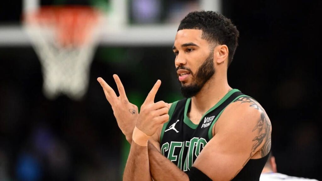 | Jayson Tatum (Boston Celtics) contre les Dallas Mavericks le 1er mars 2024 à Boston, Massachusetts. |