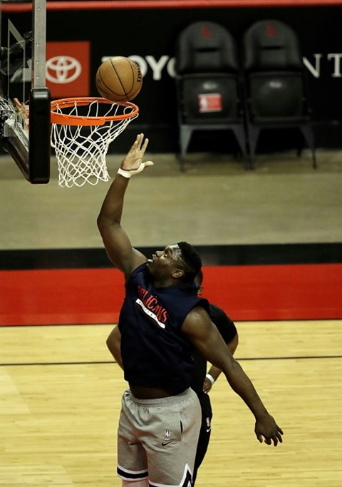 | Le N°1 des Pelicans, Zion Williamson, s'échauffe avant un match de NBA contre les Rockets, le 4 avril à Houston. |