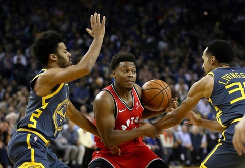 | Kyle Lowry (centre) des Toronto Raptors face à Quinn Cook (gauche) et Shaun Livingston des Golden State Warriors, à Oakland, le 12 décembre . |