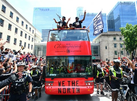 Sur leur passage, les supporteurs ont crié "Let's go Raptors" en agitant pancartes et drapeaux au passage des joueurs, qui saluaient la foule en buvant du champagne sur des bus rouge et noir roulant au pas.