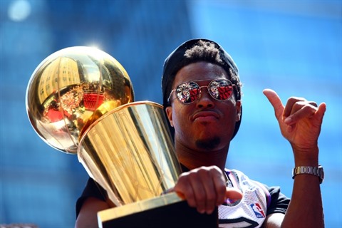 | Kyle Lowry #7 des Raptors de Toronto tient le trophée lors d'une parade en l'honneur de leur victoire au championnat de la NBA, à Toronto, le 17 juin. |