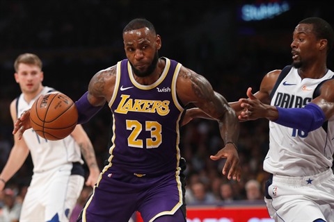 | LeBron James (centre) des Los Angeles Lakers face aux Dallas Mavericks en NBA, le 31 octobre à Los Angeles. |
