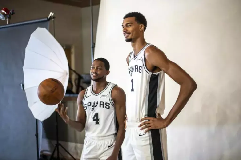 | Victor Wembanyama pose pour des photos promotionnelles aux côtés de son coéquipier De'Aaron Fox lors de la journée consacrée aux médias des San Antonio Spurs, le 29 septembre 2025 à Santonio, au Texas. |