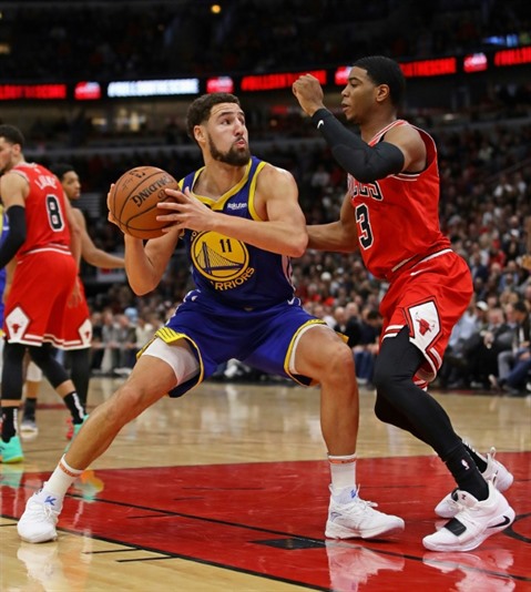 | Klay Thompson (gauche) des Golden State Warriors à la lutte avec Shaquille Harrison des Chicago Bulls en NBA, le 29 octobre à Chicago. |