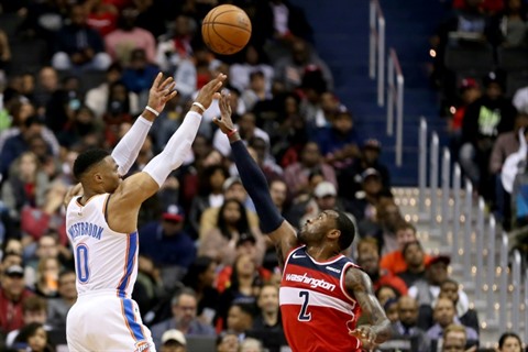 | Russell Westbrook (gauche) d'Oklahoma City Thunder tente un tir face aux Washington Wizards en NBA, le 2 novembre. |