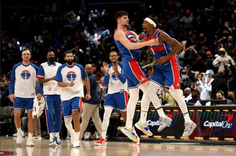 | Kentavious Caldwell-Pope et Deni Avdija des Washington Wizards célèbrent un panier inscrit contre les Pelicans de la Nouvelle-Orléans à la Capital One Arena de Washington le 15 novembre. |