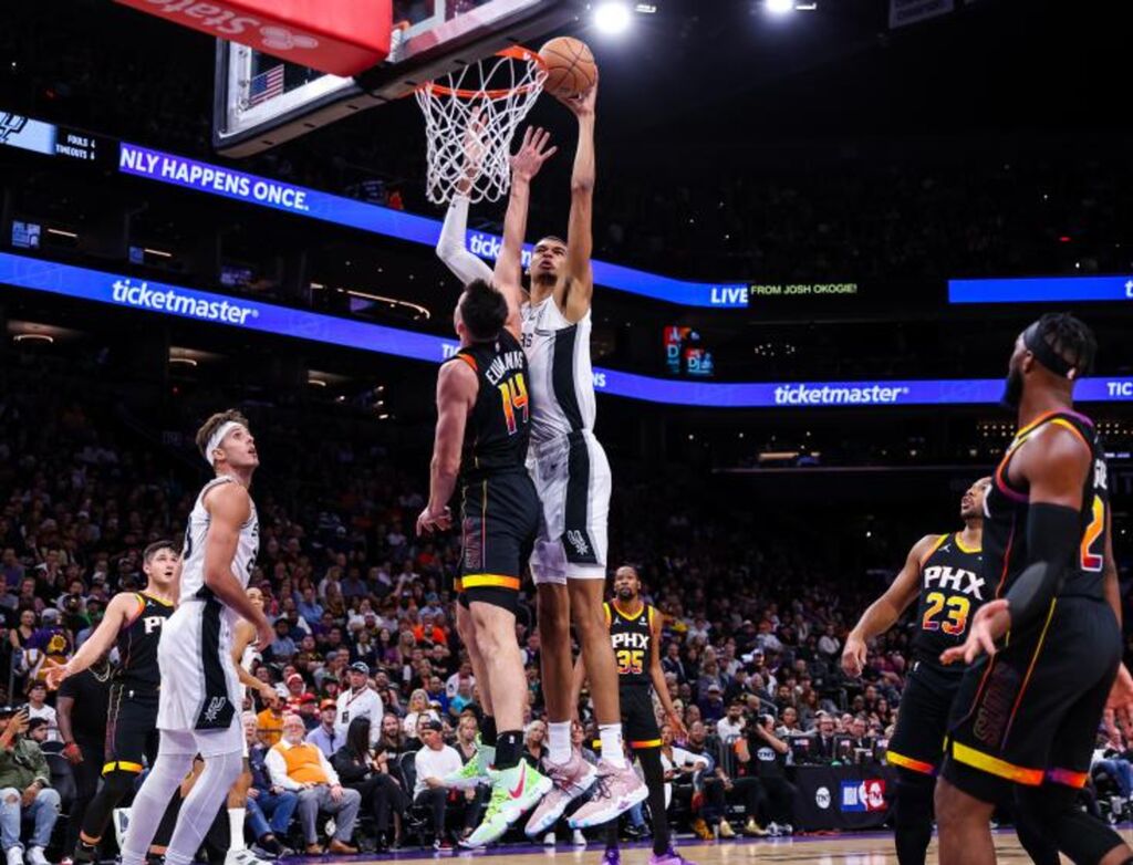 | Victor Wembanyama face à Drew Eubanks lors de la rencontre entre les Spurs de San Antonio et les Suns de Phoenix, le 31 octobre à Phoenix. |
