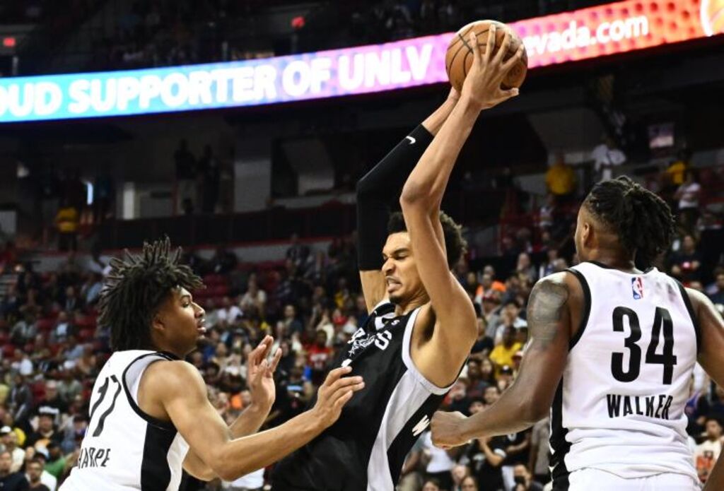 | Le Français Victor Wembanyama (San Antonio Spurs) lors d'un match de NBA Summer League contre les Portland Trail Blazers, à Las Vegas, le 9 juillet. |
