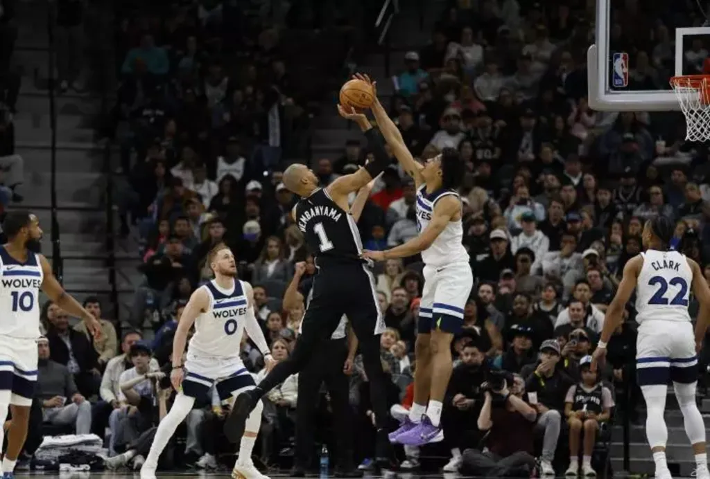 | Victor Wembanyama avec les San Antonio Spurs contre les Minnesota Timberwolves, le 17 janvier dans le Frost Bank Center de San Antonio aux États-Unis. |