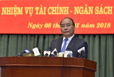 | Le Premier ministre Nguyên Xuân Phuc prend la parole lors d'une conférence récapitulative sur le finance-budget étatique, le 8 janvier à Hanoï. |