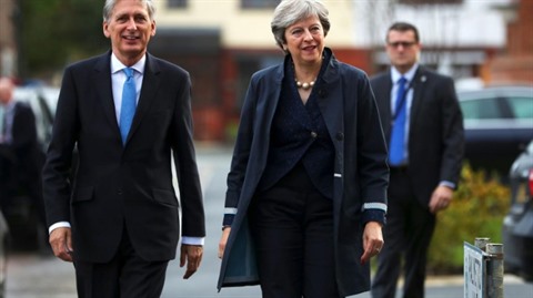 | La Première ministre britannique Theresa May et le ministre des Finances Philip Hammond, le 2 octobre à Manchester. |