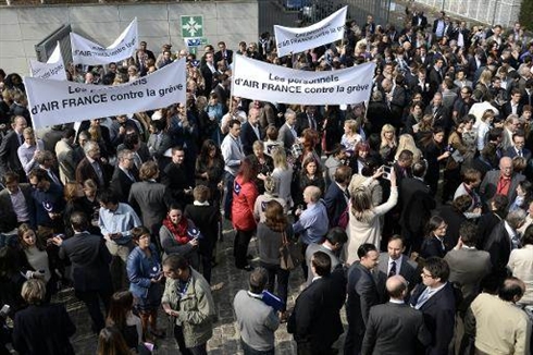 | Des salariés d'Air France manifestent à Roissy le 24 septembre, contre la grève des pilotes. |