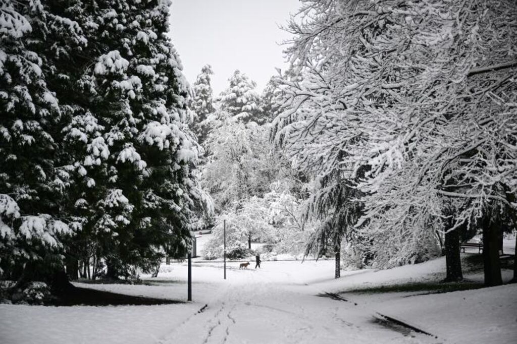 | Une personne promène son chien dans un parc après une chute de neige à Saint-Étienne, dans le Sud-Est de la France, le 15 mars 2025. |