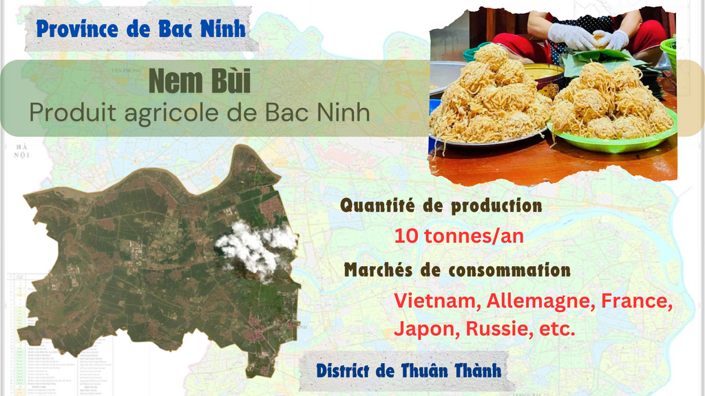 À une trentaine de kilomètres de Hanoï, Bac Ninh est connue pour ses chants populaires quan họ (chants alternés) - inscrits en 2009 sur la Liste représentative du patrimoine culturel immatériel de l’humanité, mais aussi pour sa grande richesse culinaire avec des plats délicieux qui séduisent les palais. Parmi un riche éventail de mets subtils, déguster un nem Bùi est la promesse de goûter à des saveurs inoubliables.